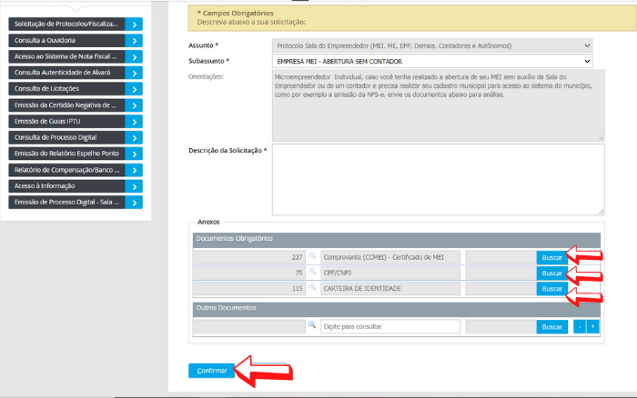 - Envie uma imagem dos documentos solicitados, quais sejam Comprovante (CCMEI) – Certificado de MEI, CNPJ e CARTEIRA DE IDENTIDADE, podendo esta última ser substituída por um documento com foto como a CNH, e, por fim, clique em “Confirmar”.