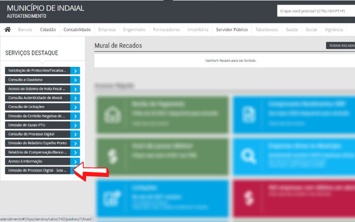 - No menu esquerdo da tela do Auto Atendimento, em “Serviços Destaque”, clique na opção “Emissão de Processo Digital – Sala do Empreendedor”