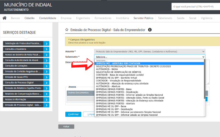 - Selecione o subassunto “Empresa MEI – Abertura sem contador”