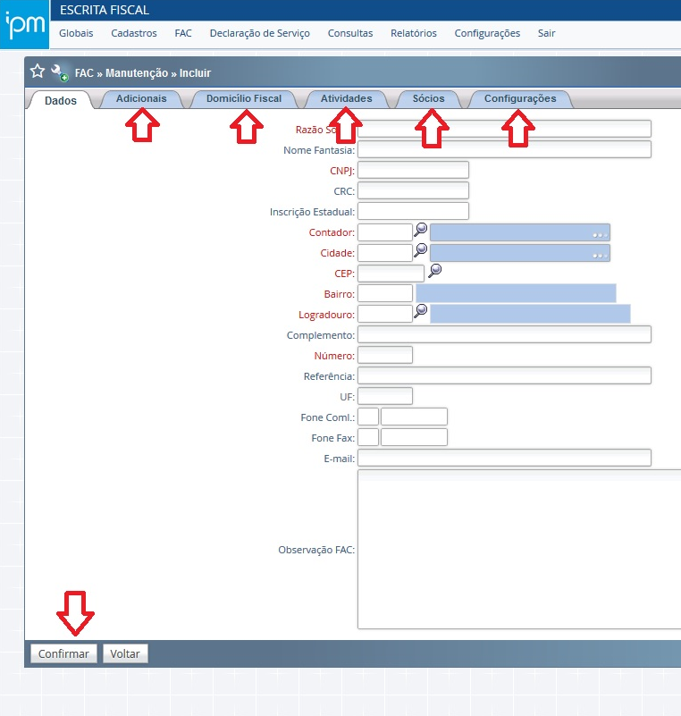 - Preencher em todas as abas, no mínimo, todos os campos em vermelho e, ao final, clicar em confirmar para que a FAC seja gravada;