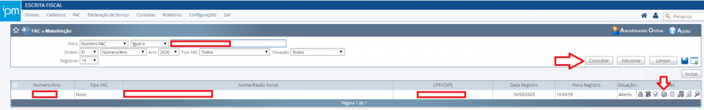 - Serão apresentadas as FAC´s já preenchidas, devendo então ser impressa a FAC desejada clicando na impressora localizada na coluna ações no lado direito da tela.