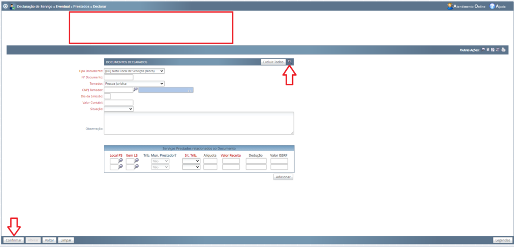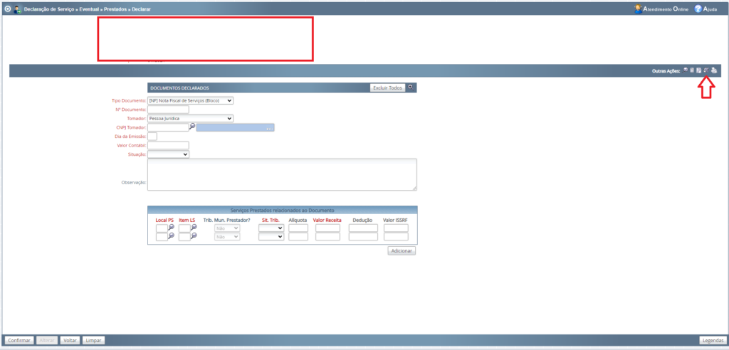 - Na nova tela poderá consultar a notas já declaradas clicando no ícone de lupa na linha Documentos Declarados, caso precise poderá declarar as notas emitidas, caso a nota ainda não esteja lançada a empresa deverá preencher todas as informações destacadas em vermelho e posteriormente clicar no botão confirmar localizado na parte inferior esquerda da tela.
