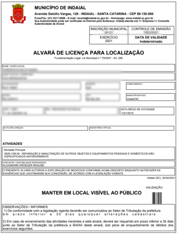 - Emissão de Alvará em Indaial: https://indaial.atende.net/?pg=autoatendimento#!/tipo/servico/valor/37/padrao/1/load/1