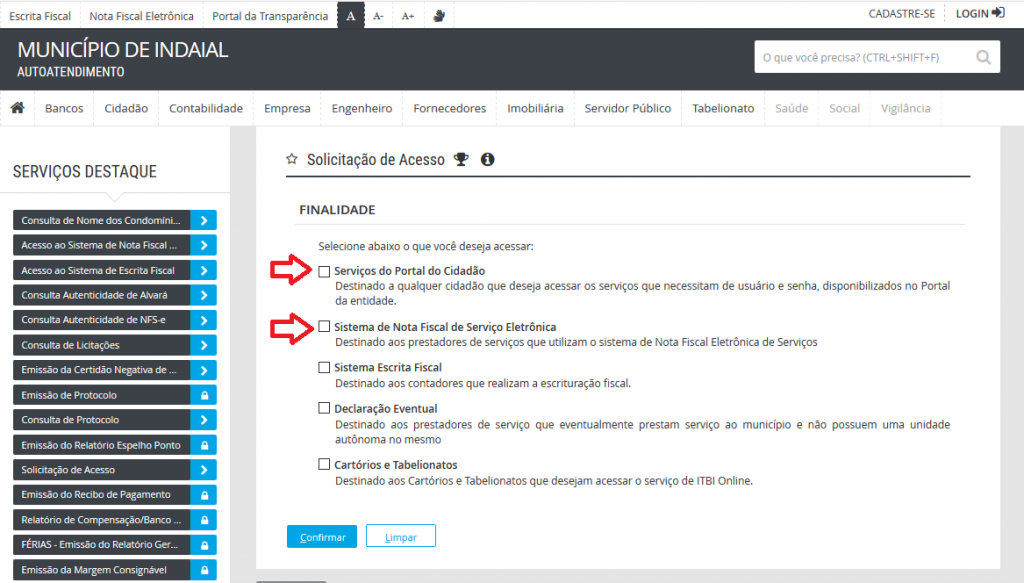 As pessoas físicas ou jurídicas que não forem contadores podem solicitar seu acesso para diversos serviços como emissão do Extrato de Débito, Emissão de guias de Alvará, Acesso para Emissão de NFS-e, dentre outros.